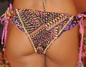 The Agua Bendita "Santa Monica" Bikini available at Butterflies and Bikinis, is a Southwestern inspired red chili pepper fabric is the perfect background for this creatively decorated triangle top with delicate hand embroidery and beading crafted in Columbia. Made from the highest quality imported European fabrics. Contrasting fabric Ruffle piecework detail is added just for fun and top is fully adjustable at neck and back.Matching hipster string tie bottoms have additional hand beading and embroidery embellishment with brilliant colored ties ending in decorative beads. Bottoms have ruched rear for flattering fit and the Latin cut provides less than moderate rear coverage. Fully lined and sold as sets.
