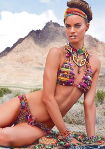 Styles like “Bendito Zambia Bikini. Multi colored Halter top in exquisitely detailed Ethnic print with matching Hipster bottom with exotic animal print detail.