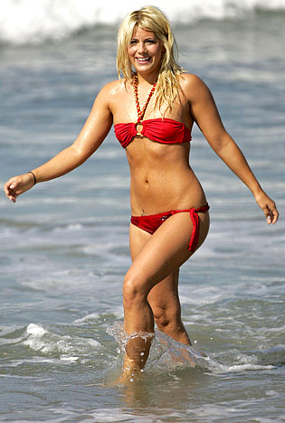 Do you remember when the the first episode of the Bachelor aired in 2002 and one of the contestants and runner up was Trista Sutter, shown here looking simply fabulous especially for a mother of two wearing a very flattering and supportive fixed triangle bikini top and moderate coverage hipster bottom.